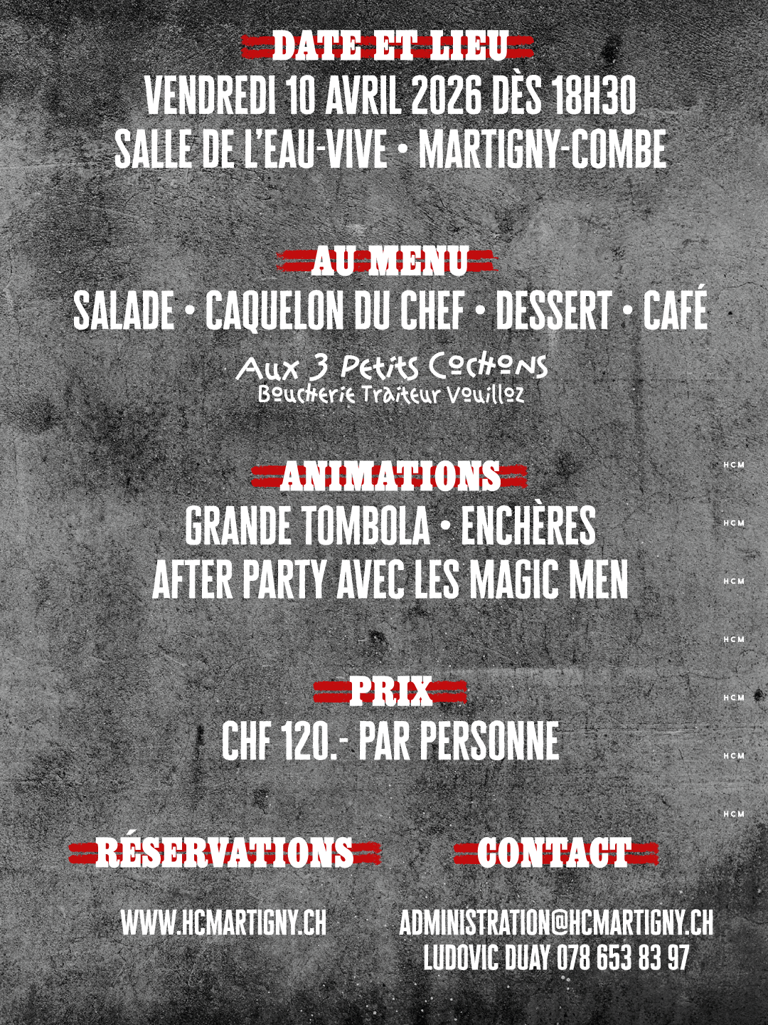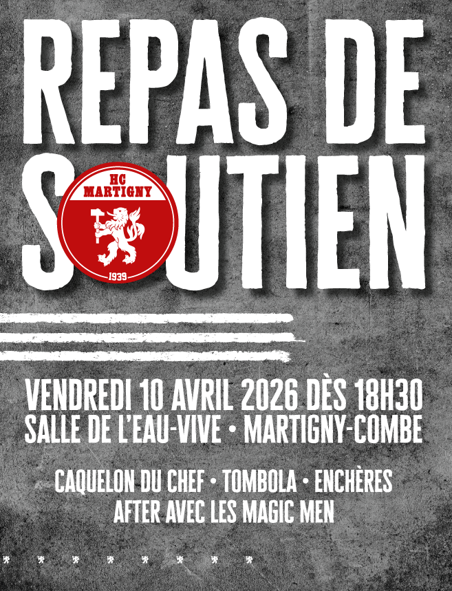 Le repas de soutien du HC Martigny aura lieu le vendredi 10 avril 2026 à la Salle de l’Eau-Vive de Martigny-Croix. Une soirée de partage, de convivialité, de fête pour clôturer cette saison 2025-2026.